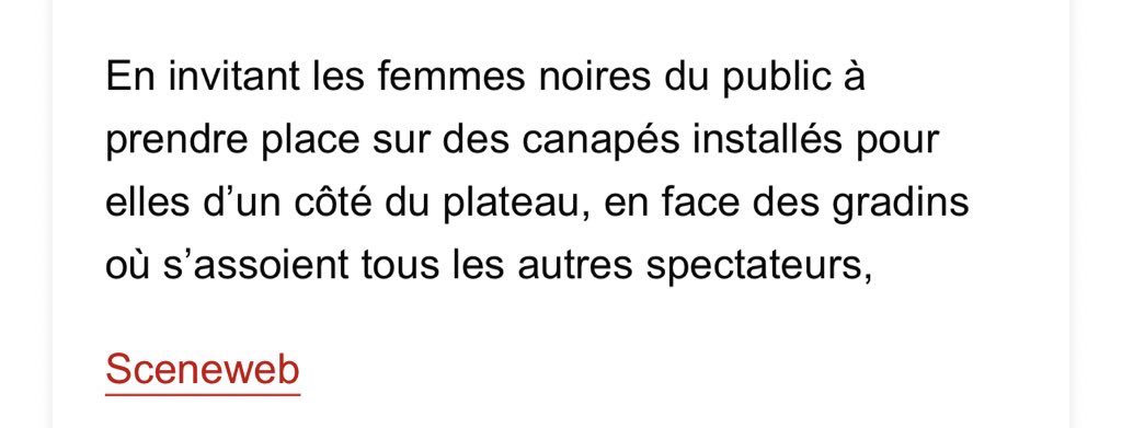 Ce spectacle prétend interroger sur la place des femmes afrodescendantes dans la société française. Mais l’ambiance favorise de façon manifeste l’opposition entre Noirs et Blancs. Dès l’entrée, les femmes noires du public ont été invitées à prendre place sur des canapés alors que le reste des spectateurs se contentent des gradins.