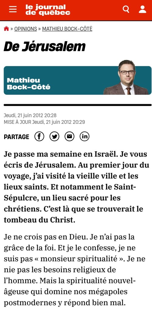 Comme beaucoup de membres du Congrès des États-Unis, du Parlement canadien, britannique, etc., M. Bock-Côté a été « sensibilisé » au point de vue israélien. C’est vraiment curieux, n’est-ce pas, comment un aussi petit État, si peu peuplé, puisse se maintenir, entouré de si nombreux ennemis, bien sûr, vraiment ce doit être un miracle de Dieu!