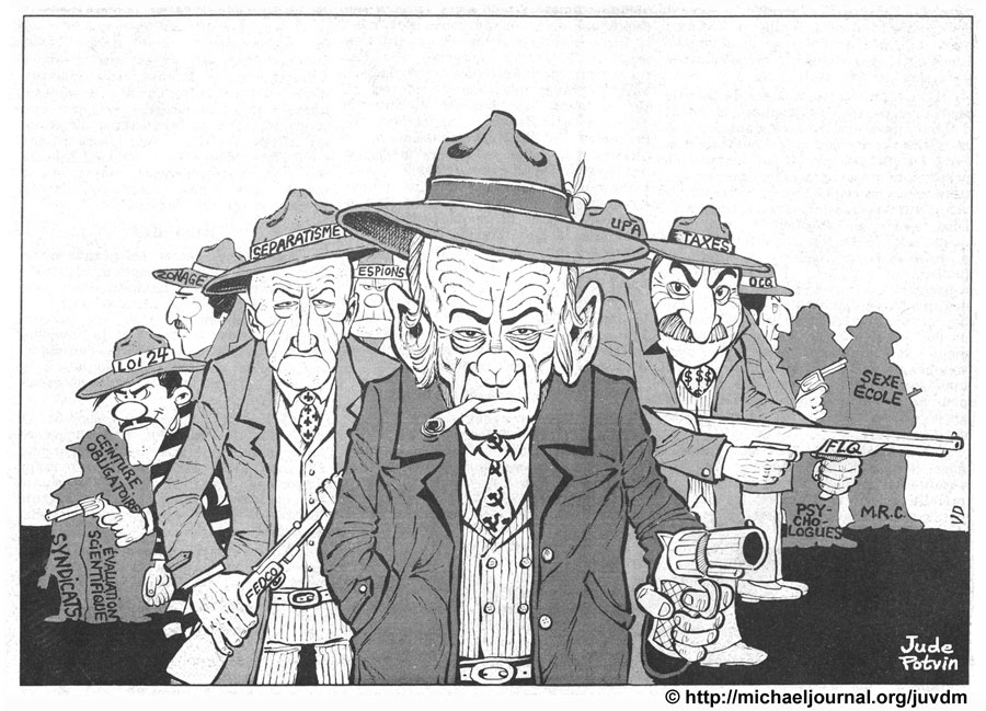 Aussi curieux que cela puisse paraître, les premiers dirigeants péquistes –attention, pas les premiers indépendantistes- sont issus de ces milieux libéraux des années 1950. Ils adhèrent aux mêmes idées. Le Canadien-Français est jugé d’office irréformable : imaginez, il va à la messe et vote majoritairement unioniste… Il fallait le transformer à tout prix afin qu’il puisse bénéficier des bienfaits de la modernité… Du temps de Maurice Duplessis, le salut ne pouvait venir que d’Ottawa. Mais survient sa mort en 1959 , puis la chute de l’Union nationale ; enfin les Libéraux provinciaux peuvent faire de l’État québécois le vecteur privilégié de la transformation tant souhaitée, cette rénovation sociale, cette fameuse «Révolution tranquille». Cependant, comme cette dernière allait de pair avec la radicalisation du nationalisme canadien-français tendant de plus en plus vers l’indépendance, les Libéraux en viennent à se diviser. Ceux qui, comme Trudeau, restent fidèles au libéralisme canadian, refusent tout compromis et comptent noyer le Canadien-Français dans un Canada multiculturel et bilingue. D’autres plus pragmatiques, comme Robert Bourassa, bien que respectueux du cadre fédéral, jugent néanmoins utile de s’appuyer sur ce néo-nationalisme, de l’entretenir, de l’encourager parfois, afin de mieux défendre des compétences provinciales parfaitement en mesure de servir la doctrine libérale.
