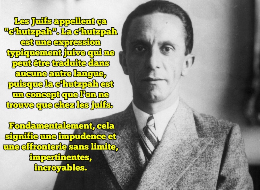 Chez eux, tout repose sur le bluff et, en règle générale, ça marche. C’est la c’hutzpah, l’arnaque au culot, dont le Docteur Goebbels a souvent parlé. Comme il le dit, un homme blanc ne peut pas concevoir que quelqu’un puisse tout oser, à commencer par mentir aussi grossièrement, avec un telle effronterie.