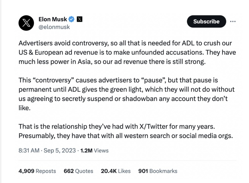 Cette « controverse » incite les annonceurs à « faire une pause », mais cette pause est permanente jusqu’à ce que l’ADL donne son feu vert, ce qu’elle ne fera pas sans que nous acceptions de suspendre secrètement ou de « shadowbaner » tout compte qu’elle n’aime pas.
